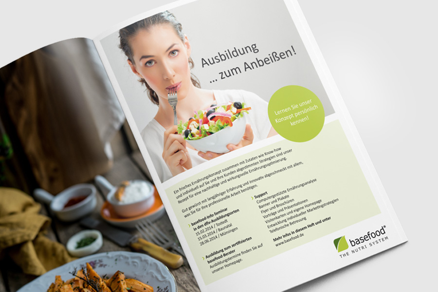 Claudia Kratzel bietet das Ernährungskonzept basefood mit ausführlicher Analyse des Ernährungsverhalten an. Als Grundlage der Printprodukte diente das bestehende CI.